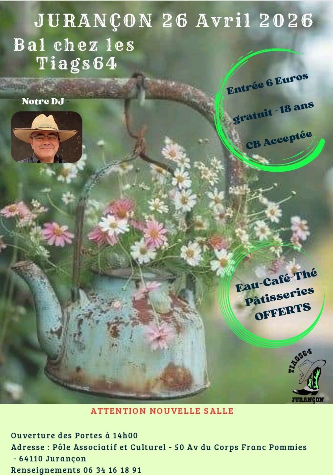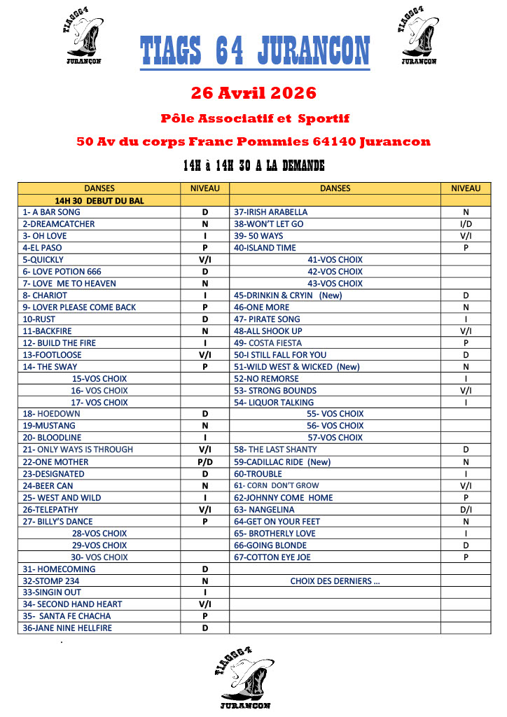 Dimanche 21 janvier nous organisons notre premier bal country cd de l’année 2024. organisé par l’association tiags64 de country dance line de jurançon. C’est un bal pour les débutants, novices et intermédiaires. Celui-ci aura lieu dans la salle de l’atelier du neez de Jurançon, à partir de 13h30.